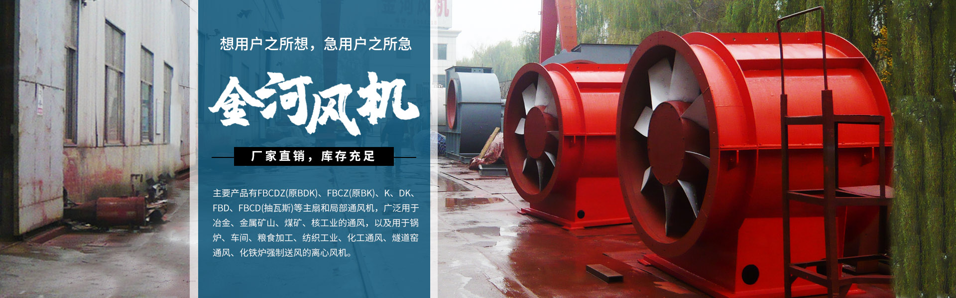 淄博金河風機有限公司位于山東省淄博市周村區南郊鎮。東倚博萊高速,西臨濟青高速,南靠309國道,北傍膠濟鐵路,交通方便,通發達。我公司技術力量雄厚,制造設備精良,測試手段完善,產品均有生產許可證、煤礦礦用產品安全標志證書和防爆合格證。提供70多個系列,800多種規格。主要產品有FBCDZ(原BDK)、FBCZ(原BK)、K、DK、FBD、FBCD(抽瓦斯)等主扇和局部通風機,廣泛用于冶金、金屬礦山、煤礦、核工業的通風,以及用于鍋爐、車間、糧食加工、紡織工業、化工通風、燧道窯通風、化鐵爐強制送風的離心風機。